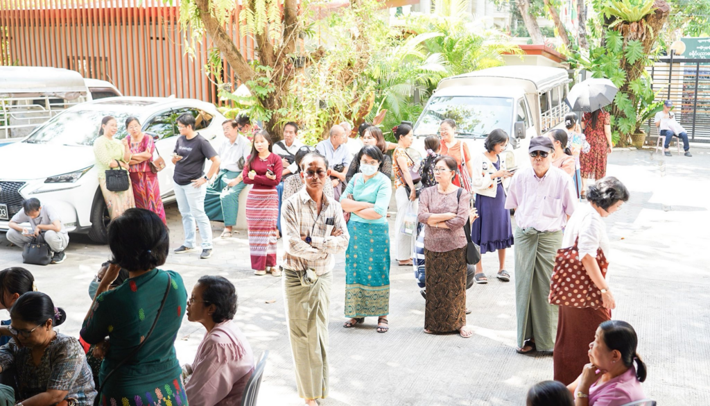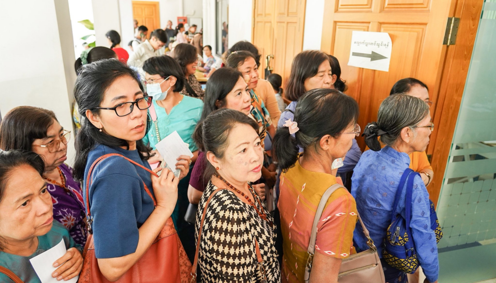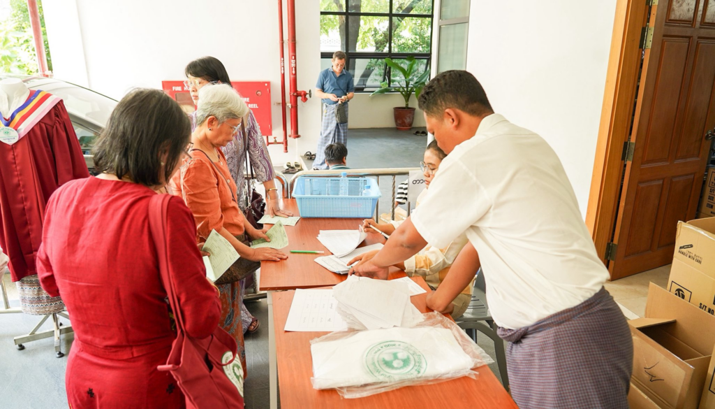 ဒီပလိုမာလက်မှတ် နှင့် B.A ဘွဲ့ အပ်နှင်းခြင်း အစီအစဉ် အတိုင်း ယနေ့ ၁၀/၁/၂၆ မှစ၍ ဒီပလိုမာ အတွက် စလွယ်နှင့် သုတဓမ္မဂဝေသီ အတွက် ဘွဲ့ ဝတ်စုံ ရန်ကုန်မြို့ အနုဂ္ဂဟရုံး၌ လာရောက်ထုတ်ယူနေကြသည့် မြင်ကွင်းများ